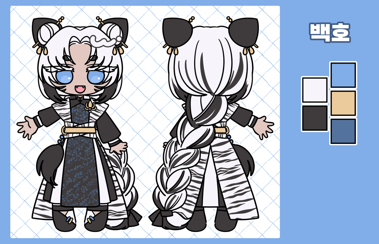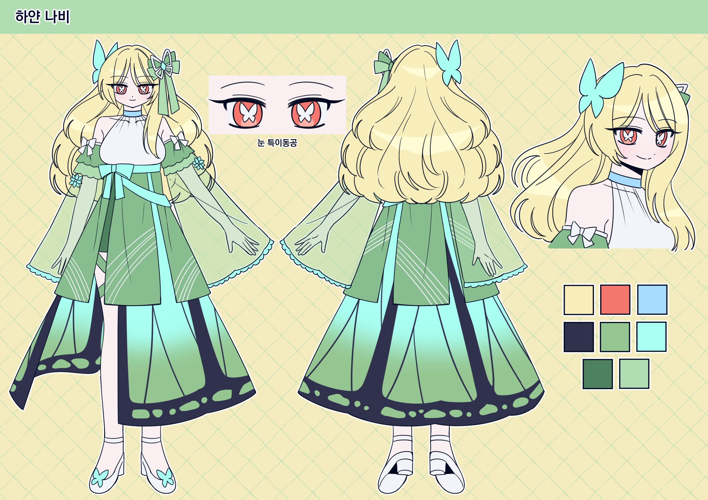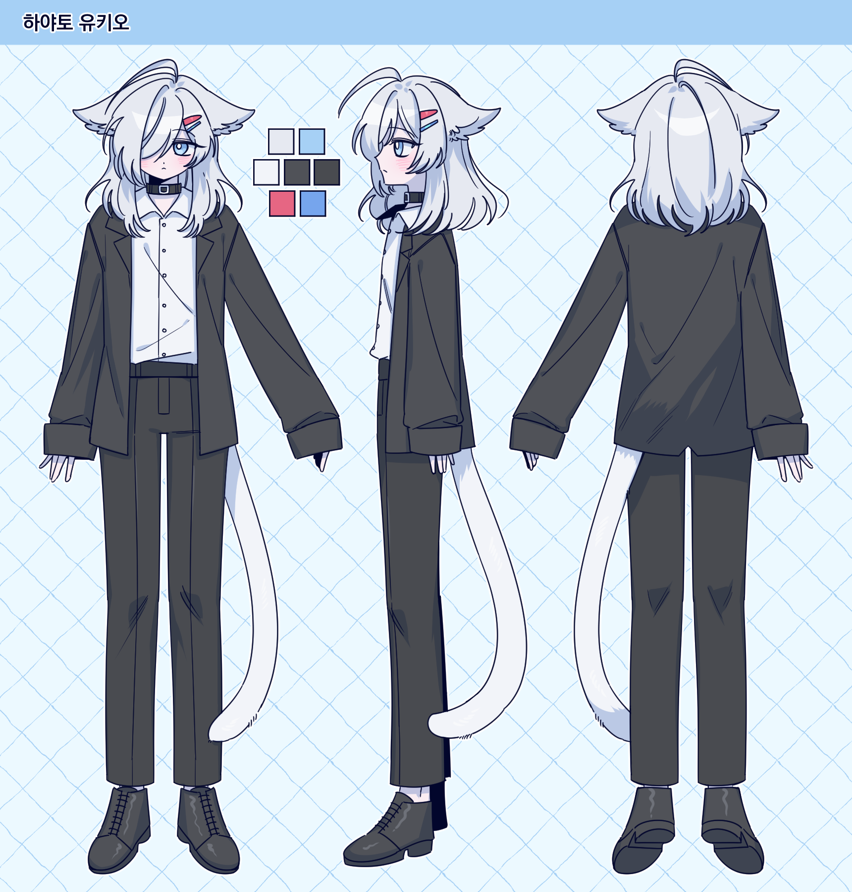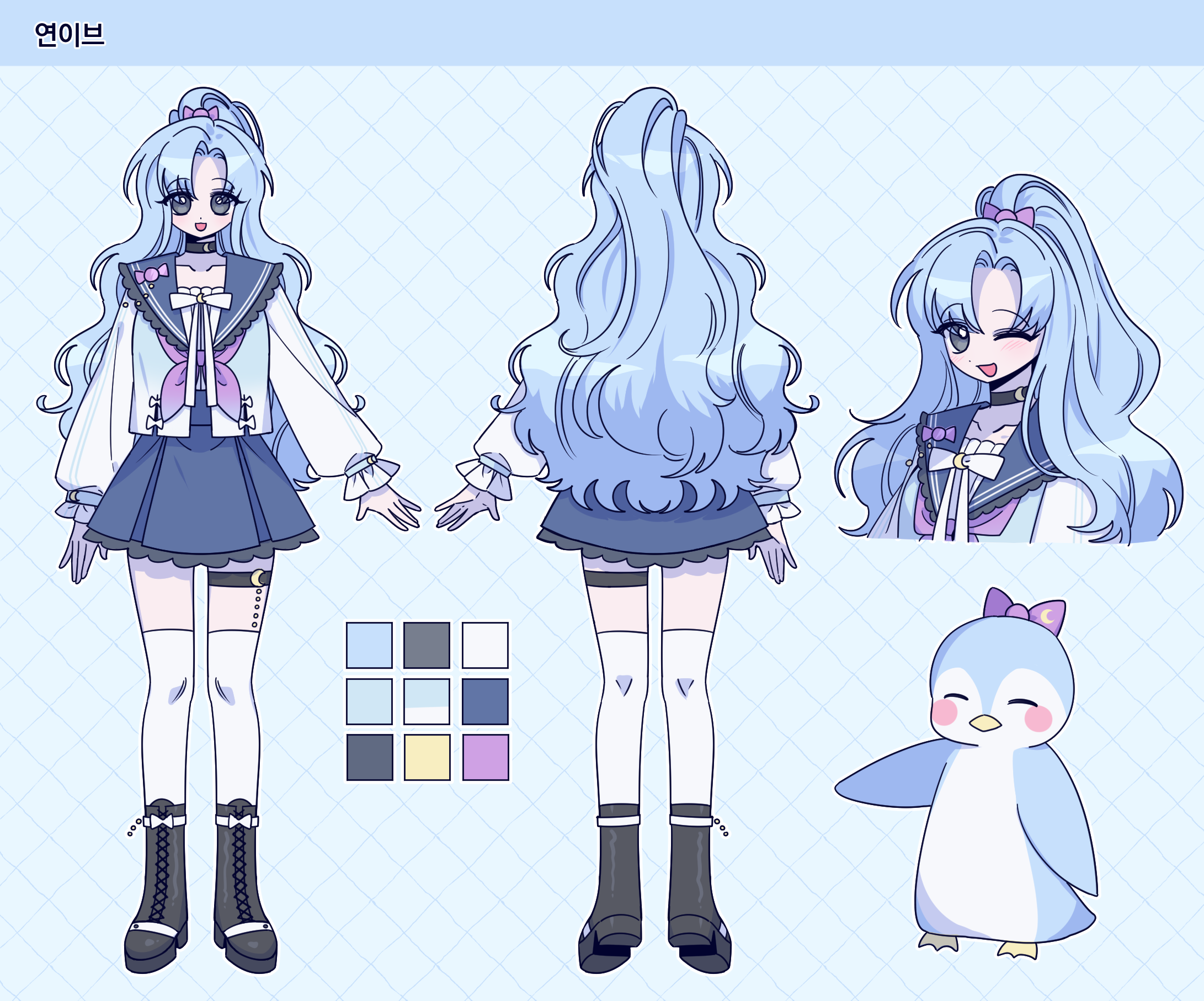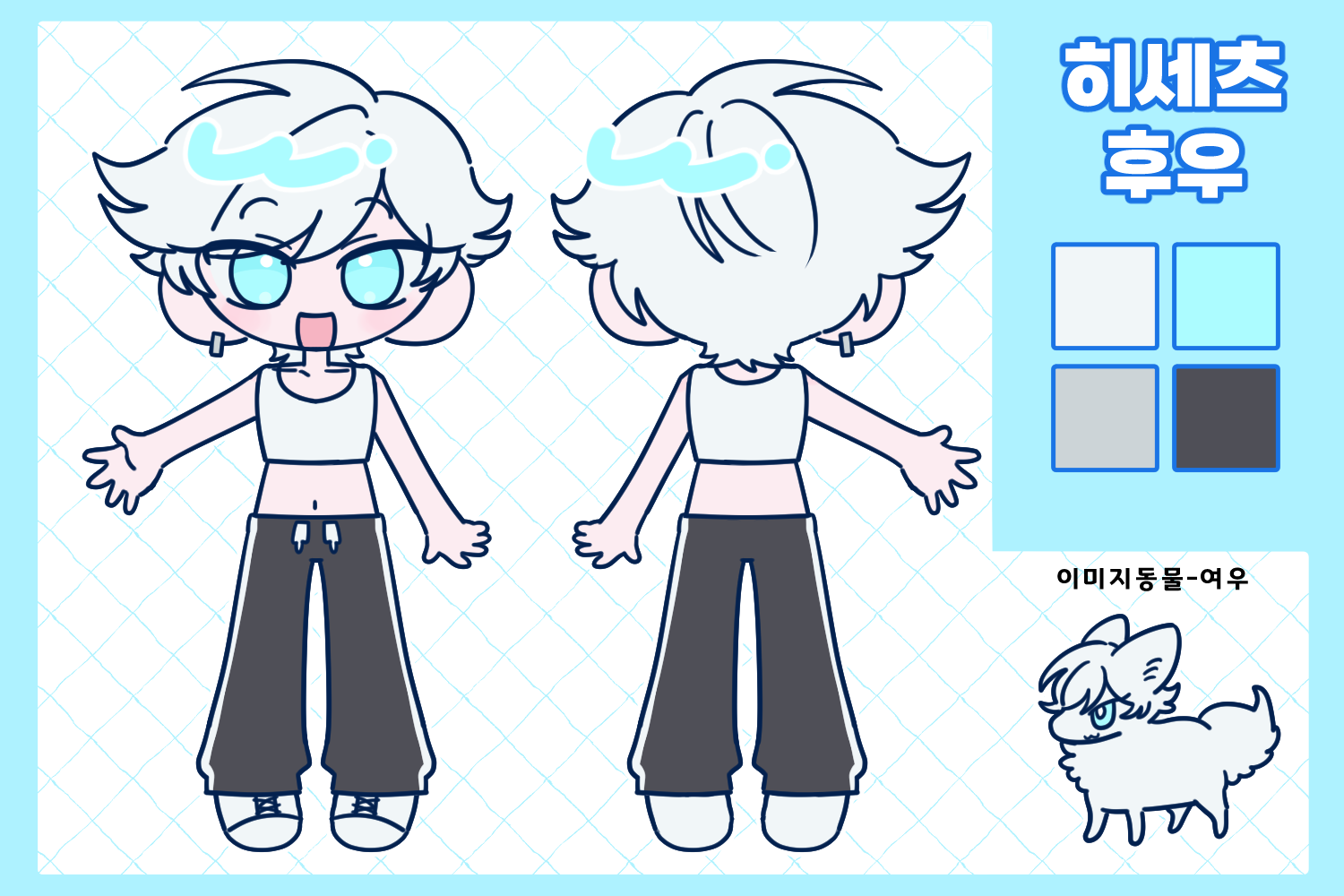 - 캐릭터 자료: (외관 사진 및 글 서술. 컬러파레트 있는 경우 제공해주세요. 이름도 같이 적어주세요)